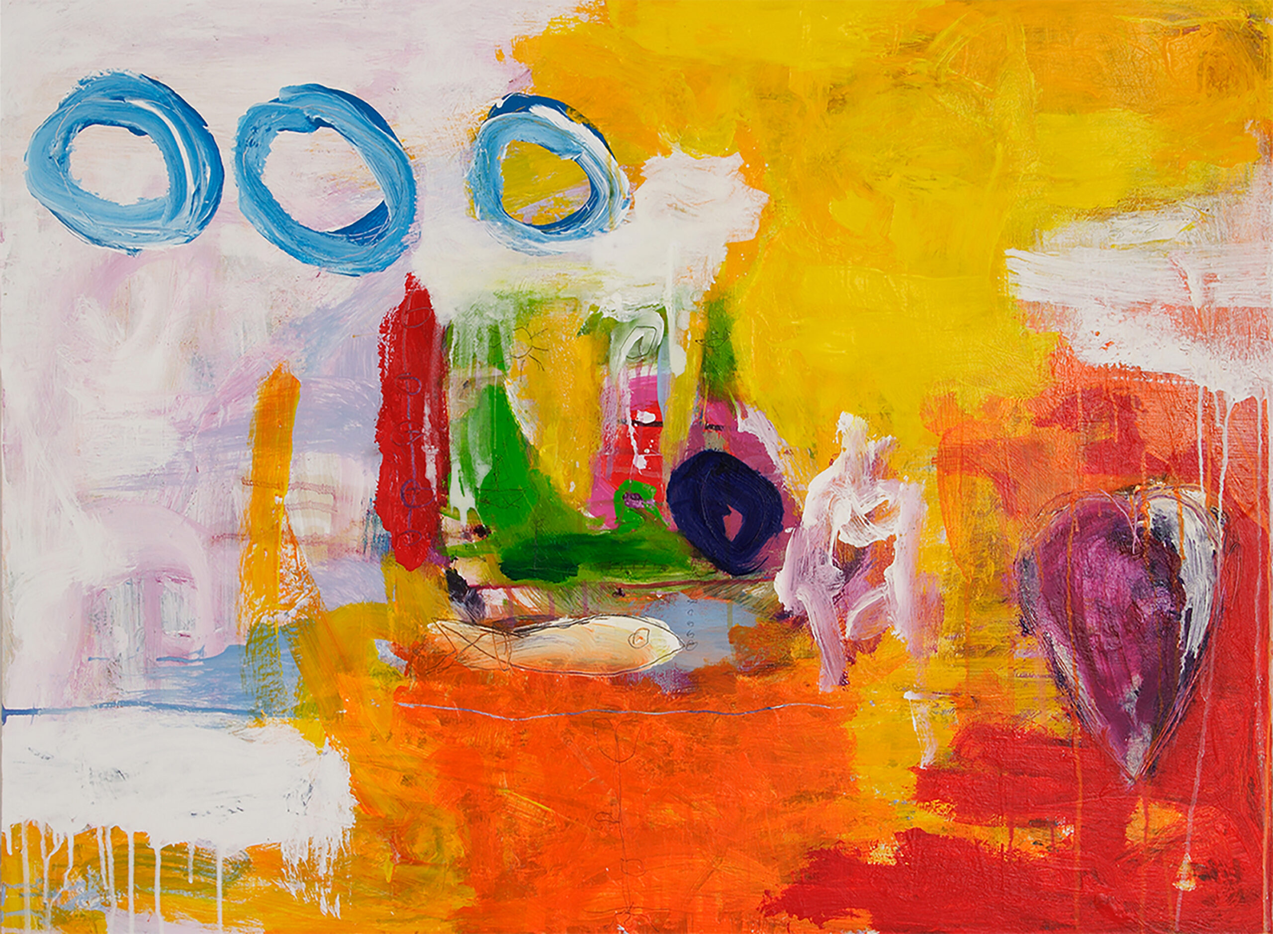 doch was hat diese Story mit meiner Kunst zu tun ? Durch diesen Vorfall entstanden kurz nacheinander eine Abhandlung von Kunstwerken, die ich nicht einordnen konnte; insbesondere wie sie durch mich entstanden und weshalb dies so geschah. Zurück im Atelier schwebte ich zu diesem Zeitpunkt wie auf Wolken und meine Werke malte ich aus einem schwerelosen Trance Zustand. Ich empfand diese Wochen wie zwischen Himmel und Erde existierend, keine Bodenhaftung mehr und dabei mit einer Taschenlampe suchend unterwegs zu sein. Zuvor waren infantile figurative Elemente nie in meinen Bildern sichtbar, danach erfühlte ich sie und sie füllten meine Leinwände. Staunend und überrascht von dieser Symbolik, die ich nicht einordnen konnte.