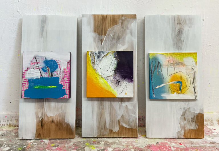 Das 2020er Werk war am Trocknen, und ich sah vor meinem geistigen Auge, dass die Bücher und das Holz zu Votivtafeln/Votivbildern vereint werden wollten.