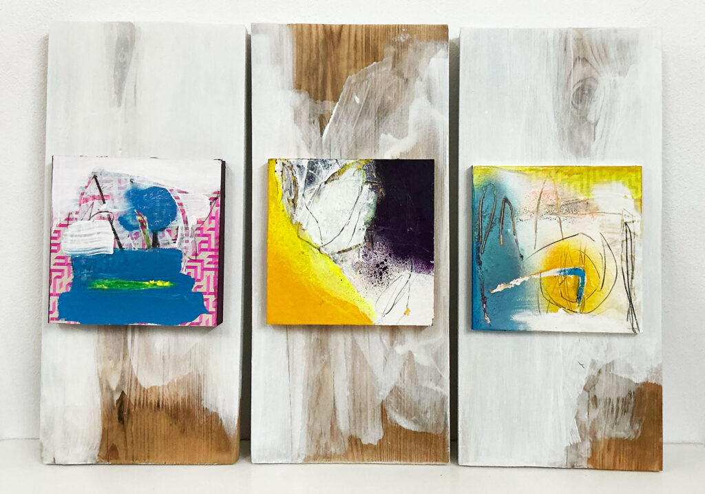 Das 2020er Werk war am Trocknen, und ich sah vor meinem geistigen Auge, dass die Bücher und das Holz zu Votivtafeln/Votivbildern vereint werden wollten.