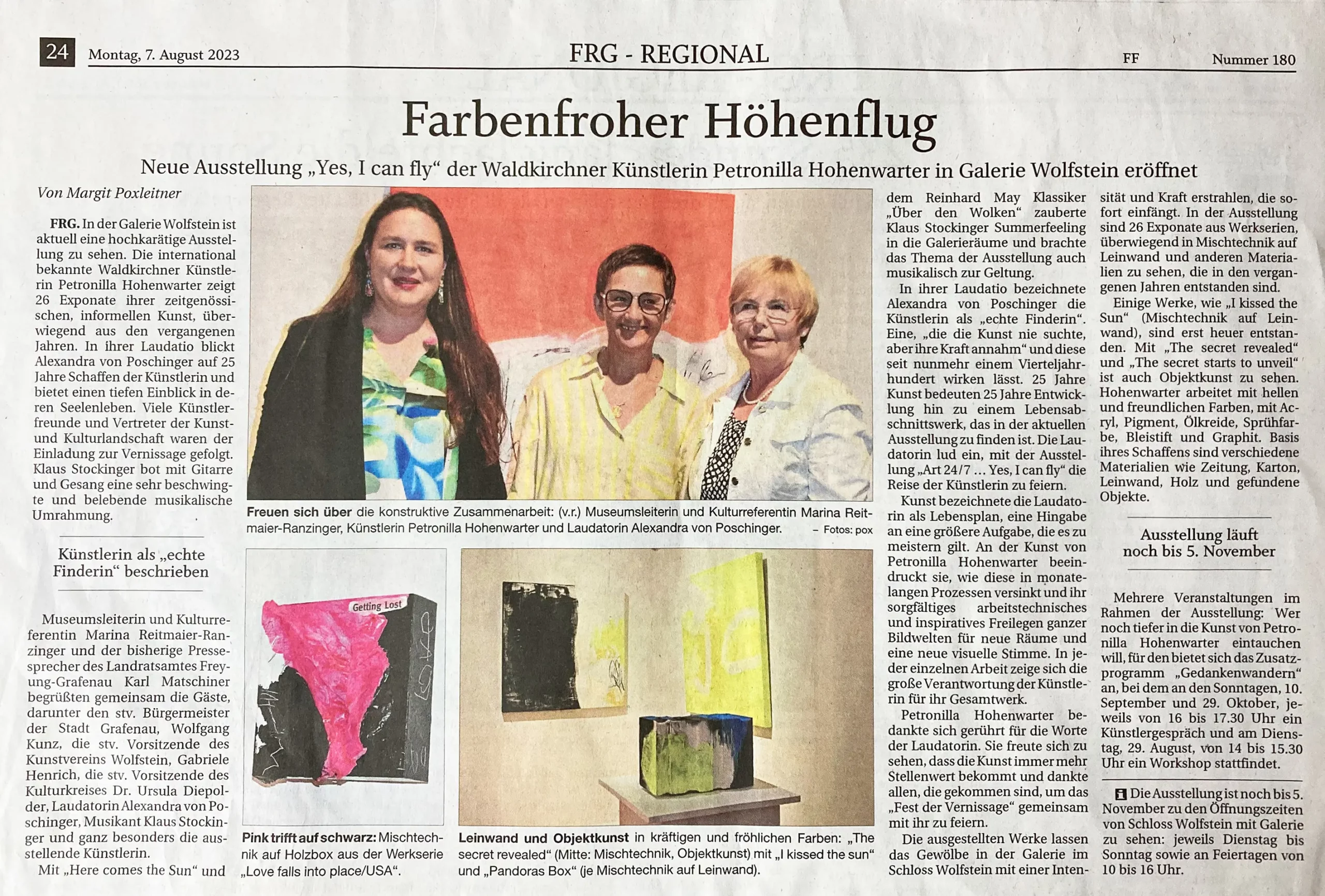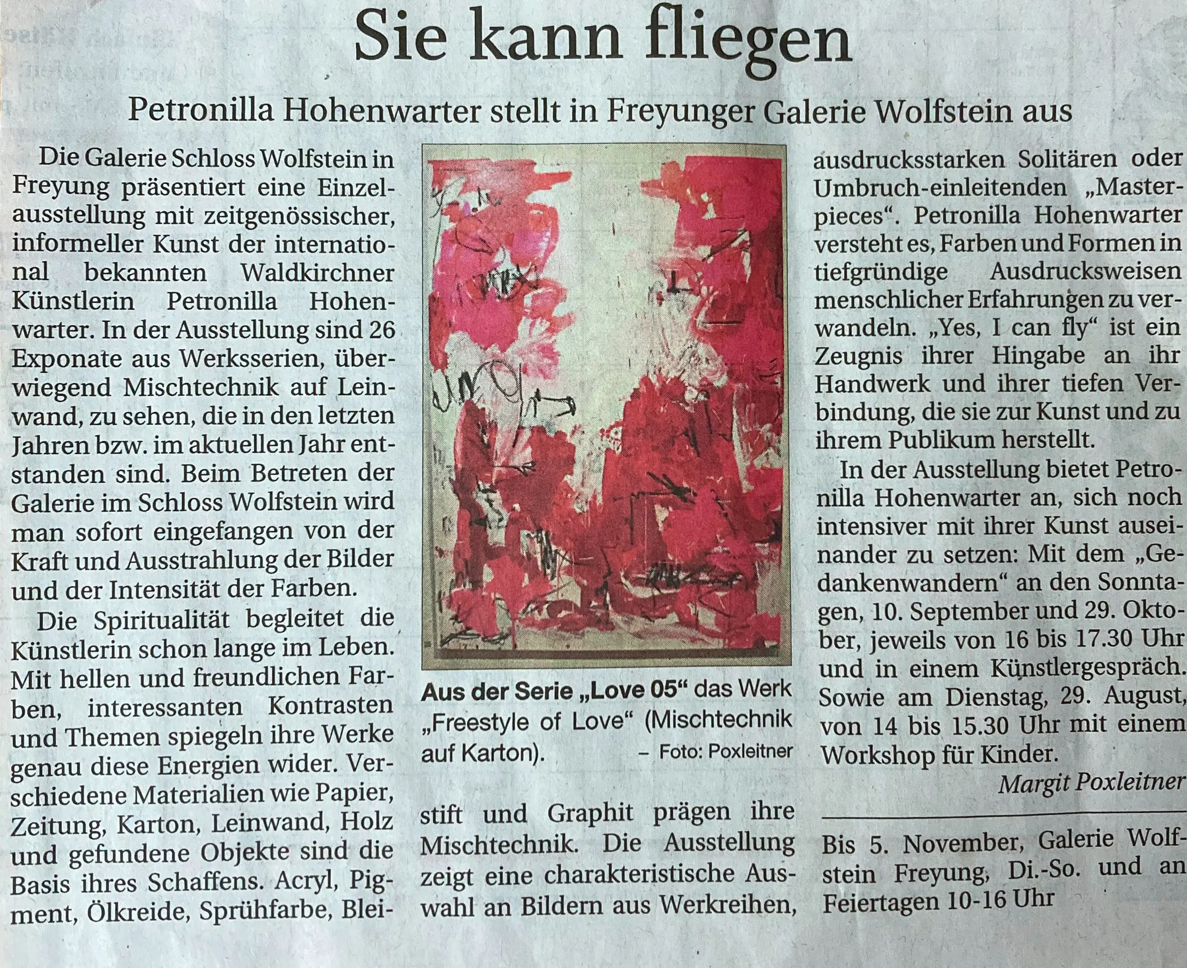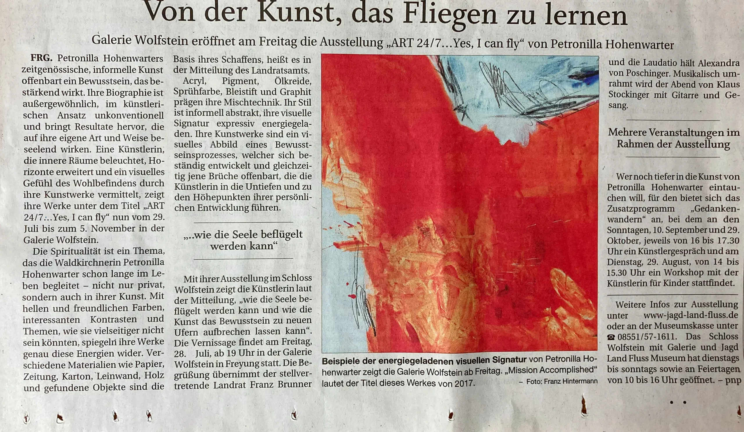 Petronilla HohenwARTer präsentiert mit ihrer zeitgenössischen informellen Kunst in dieser Kunstausstellung im Schloss Wolfstein ein Gefühl, welches im abstrakten Sinne eine bewusstseinserhellende Wirkung ermöglicht. Für die Künstlerin ist der Titel der Ausstellung ein visuelles Abbild eines Bewusstseins, welches ihr bestärkend seit Beginn ihrer Selbständigkeit in der Kunstszene zur Seite steht. Wenn wir an uns glauben und uns selbst vertrauen, öffnen wir uns für die Möglichkeit, unsere inneren Bilder Wirklichkeit werden zu lassen. Fliegen als eine Metapher für die Verwirklichung von Träumen, Visionen und dabei Haltung zu beziehen. Die Passion der Künstlerin mit ihrer expressiven Signatur setzt in ihren kreativen Schaffensprozessen jene Energie frei, die auf den ersten Blick informell abstrakt, unkonventionell und mächtig erscheint. Jenseits vom linearen Raum- und Zeitdenken ermöglichen Petronilla HohenwARTers Kunstwerke jedoch einen feinen und subtilen Zugang in jene Bewusstseinsschichten , die den geistigen und seelischen, sowohl als auch den physischen Raum nähren. Zeitgenössische Kunst, die aufweckt, stimuliert und Bewusstsein schafft. Eine Künstlerin, die nach ihren eigenen Bedingungen die Welt mit ihrer Kunst bespielt, dadurch innere Räume beleuchtet , bewusst Horizonte erweitert und ein visuelles Gefühl des Wohlbefindens durch ihre Kunstwerke vermittelt.