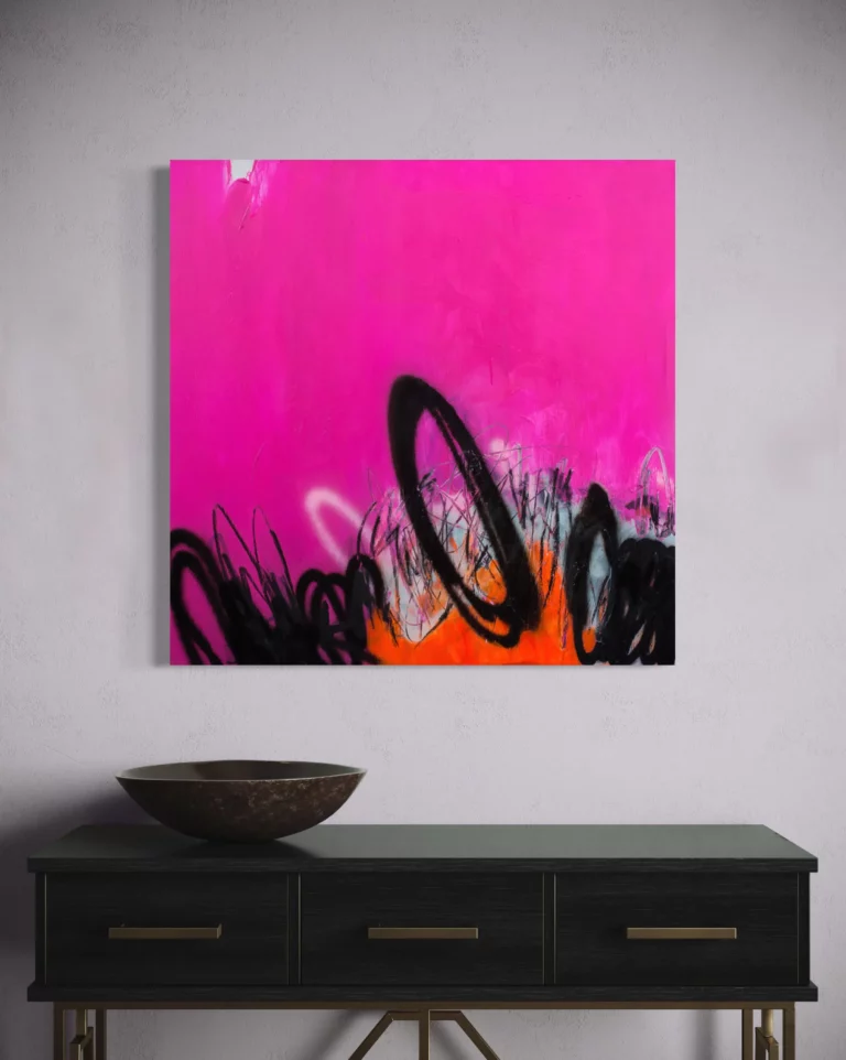 Eine Mischtechnik auf Leinwand mit Acryl, Öl, Kreiden, Graphit, Pigment und Sprühfarbe. Die Widerstandskraft als ovales schwarzes Signet tritt in der Mitte über das Orange und den dahinterliegende Schichten und Facetten hervor; präsentiert sich mit dem Pink der Liebe in seiner vollen Kraft und Größe, zeigt ihre Würde und erhebt sich mittig aus all den darunter liegenden bewussten und unbewussten Ereignissen – willkommen Resilienz|Resilience.